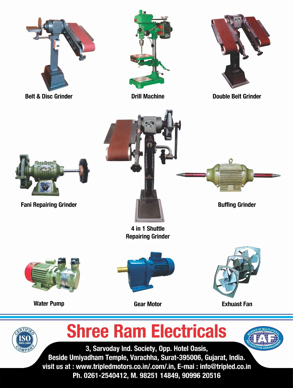 Tripled Motors Shree ram electricals manufacturer of following products:- 1) BENCH GRINDERS. 2) BUFFING GRINDERS. 3) GEAR MOTORS. 4) WATER PUMPS. 5) EXHAUST FANS. 5) BELT GRINDERS. 5) DRILL MACHINES. 6)EXHAUST FANS. 7)TOOL GRINDERS. 8) BENCH POLISHER. 9)DISC SANDER. 10) BELT SANDER. 11)Gear Motor. 12) buffing machine 13)single phase induction motor